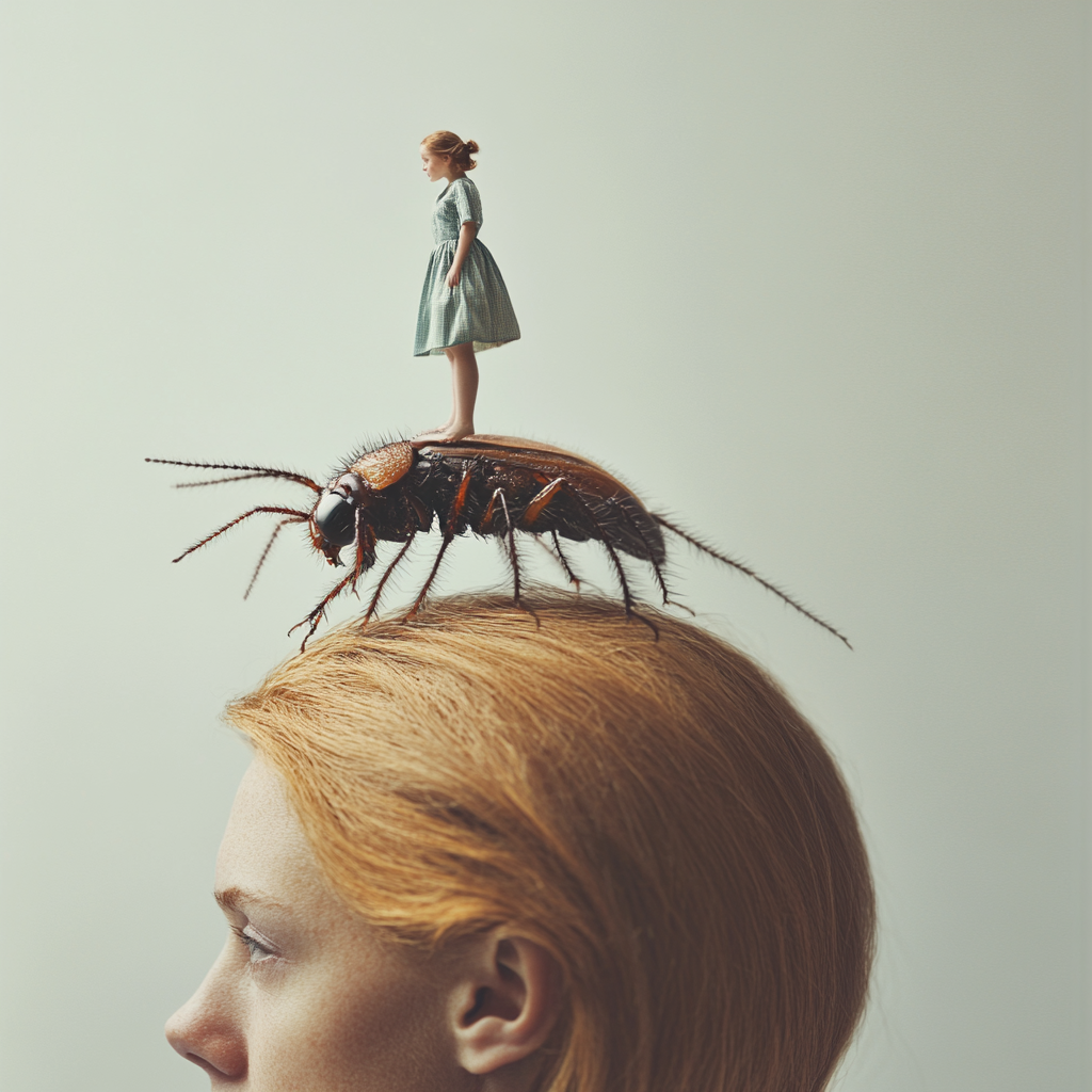 I was generating some images for another side project when I thought, "Hey just for the giggles why don't I ask Midjoureny to create something from this prompt - a woman the size of a flea walking on top of someone's head" - and it came up with this image...